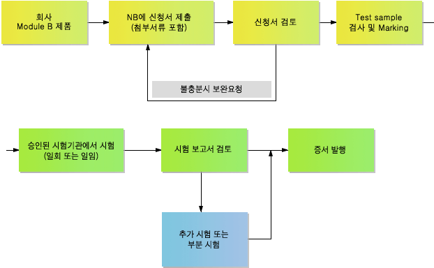 NB는 해당 정부에 보고 및 사후 관리를 받는다. 형식 승인 및 공장 승인은 EU Directive의 Annex A1의 제품 및 설비에 한하여 Annex B에 정한 Module for Conformity-Assessment에